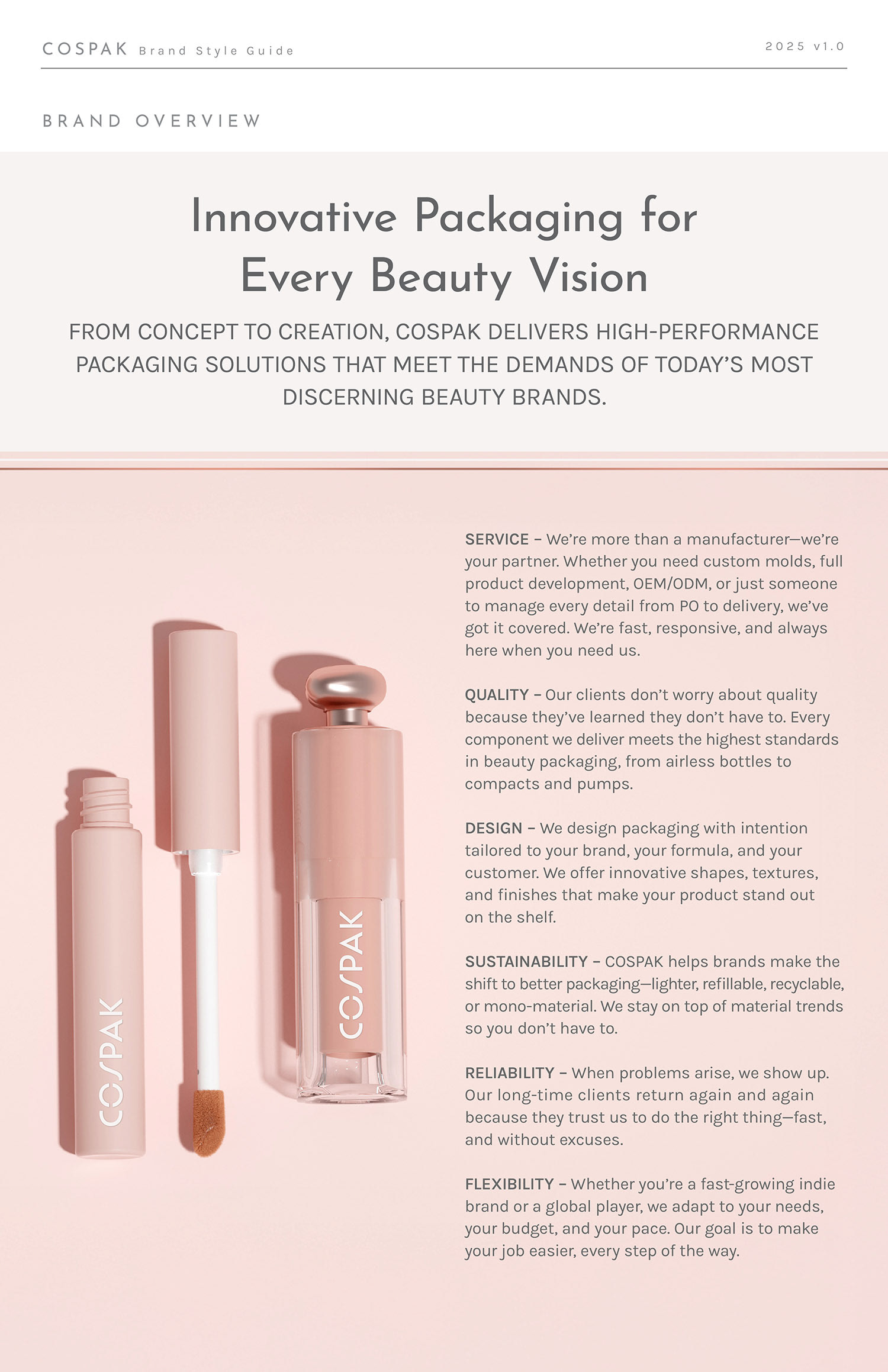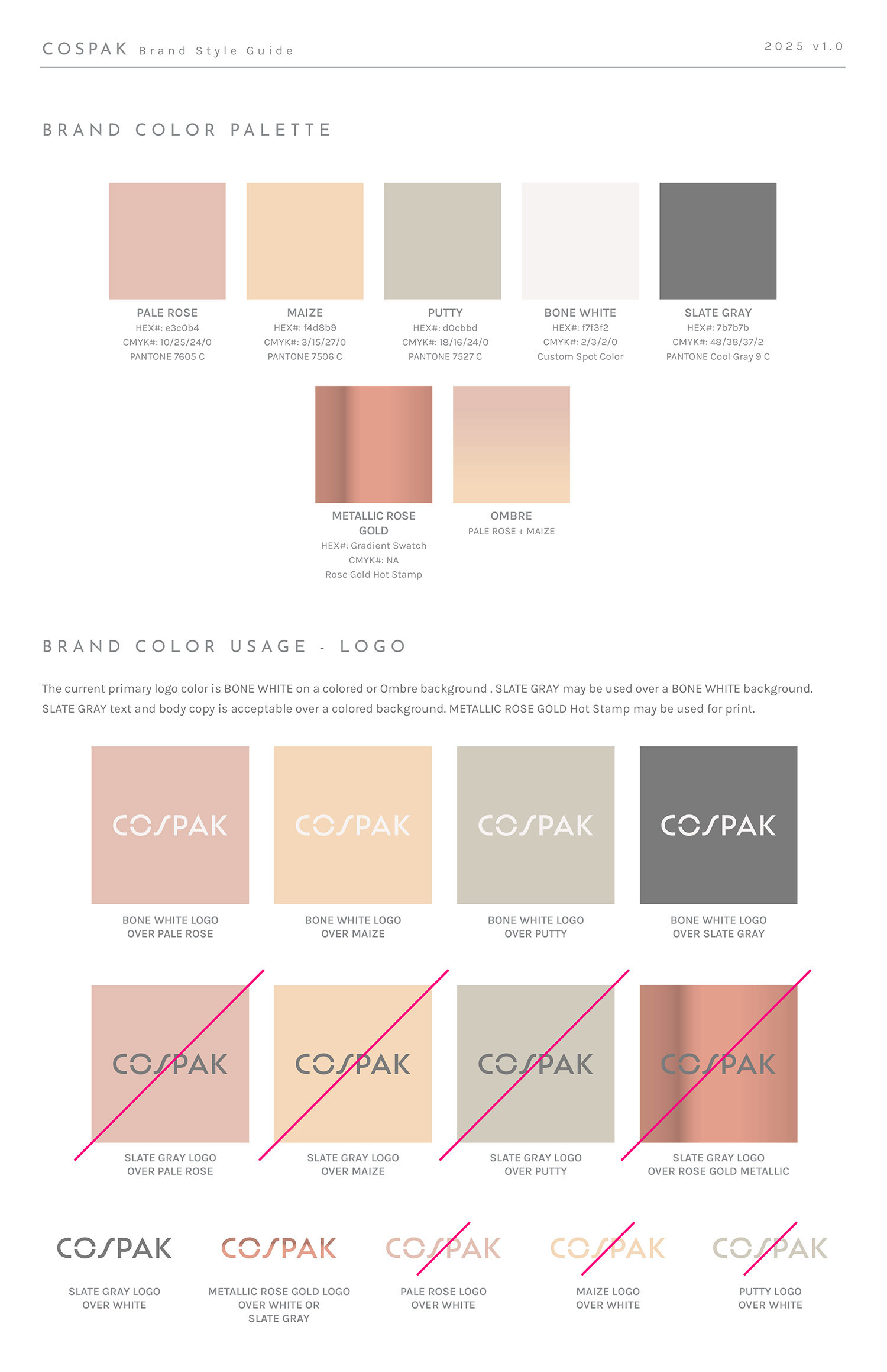 Cospak — logo design, branding, and style guide for a leader in cosmetic packaging. Branding and creative direction by Chris DiGiacomo, Miami
